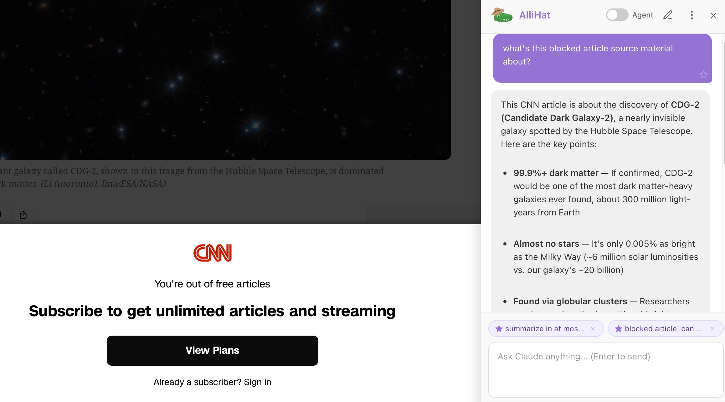 Open it, and it already sees what you’re reading. Ask it anything: summarize this, explain that, what sources is this blocked article talking about. Without leaving the page. No copypasta.